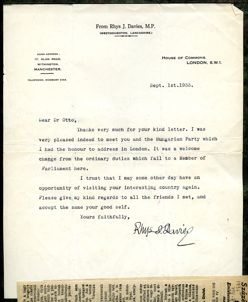 Letter from Rhys John Davies to Dr Ottó Légrády, Siklóssy Coupures Album, 138-0008