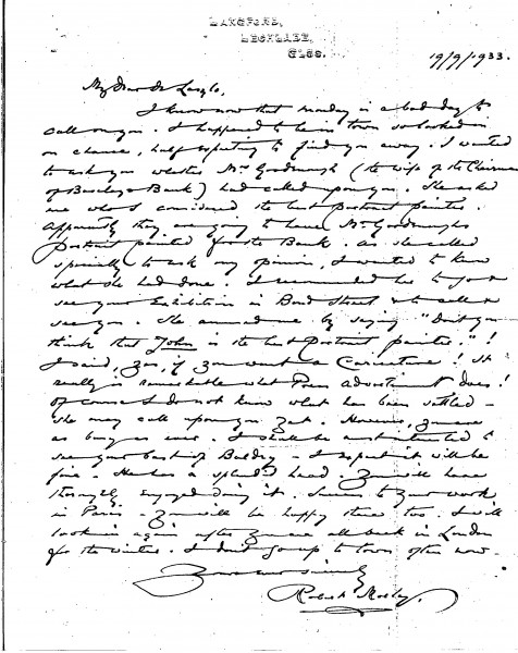 Morley inquires whether Mrs Goodenough, seeking a portraitist for her husband, followed his recommendation to view de László’s work; he critiques Augustus John’s popularity as press-driven, expresses interest in de László’s bust of Baldry [3583], and wishes him success with his work in Paris.