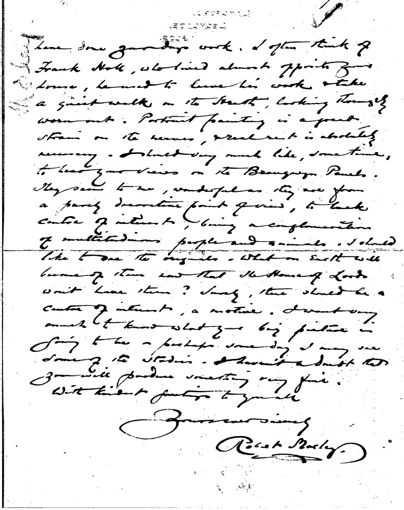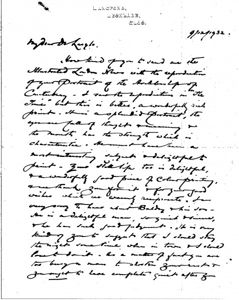Morley thanks de László for sending a reproduction of the Archbishop of Canterbury portrait [6161], praising the work and sharing thoughts on the strain of portrait painting. He expresses interest in the Brangwyn Panels and what will become of them, and looks forward to seeing de László's "big picture".