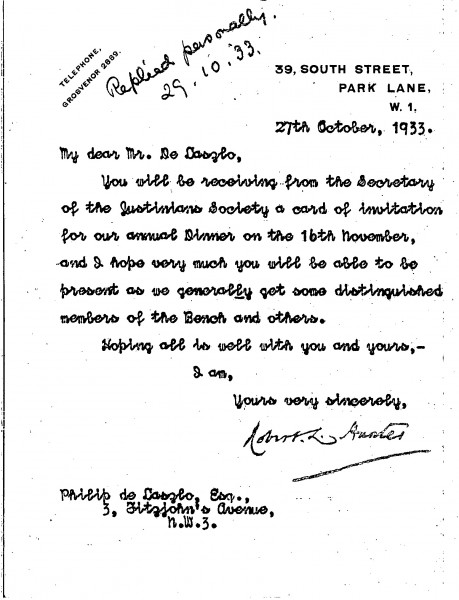 Concerning an invitation to the Justinian Society's annual dinner, which Hunter hopes de László will attend.