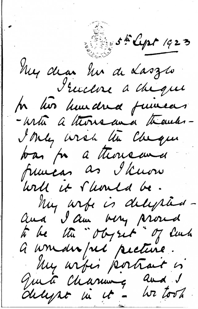 Sir Roger Keyes sends de László a cheque for two hundred guineas. He praises both his own portrait [5990] and that of his wife [5980]. They are having a reproduction framed. He thanks de László for gifting them a study portrait of his wife [5978].