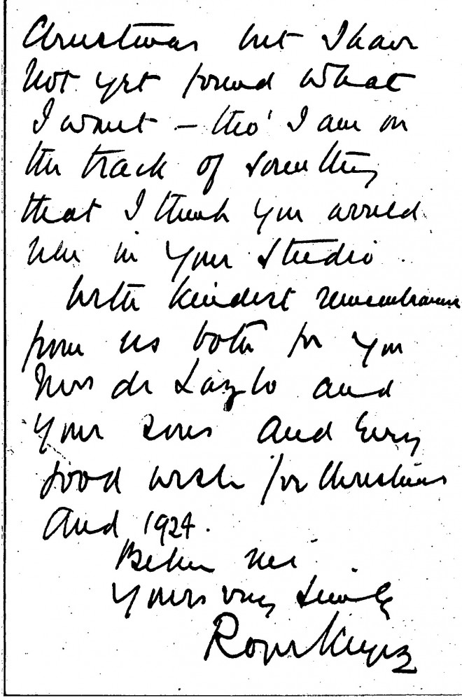 Letter from de László's secretary to J. R. Bailey, Studio Correspondence Nov 1920 - Apr 1924 Various Art Societ, 105-0013