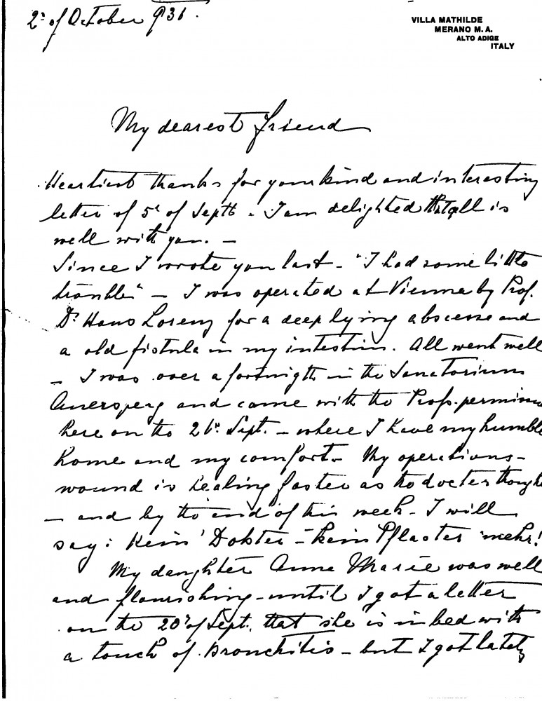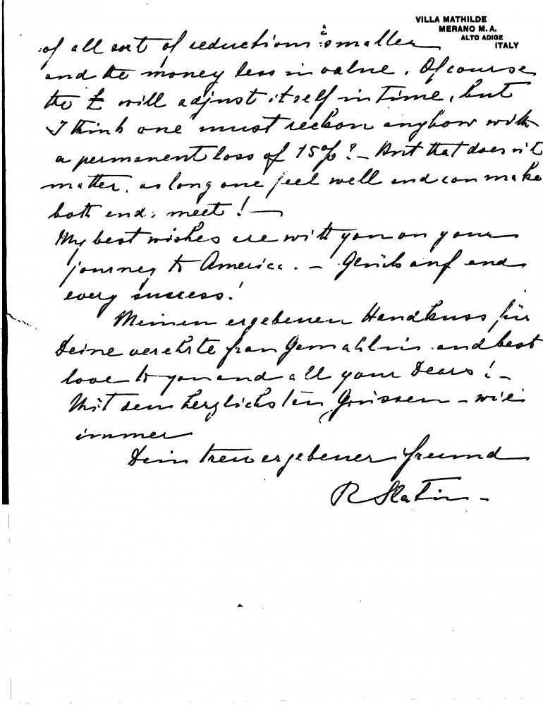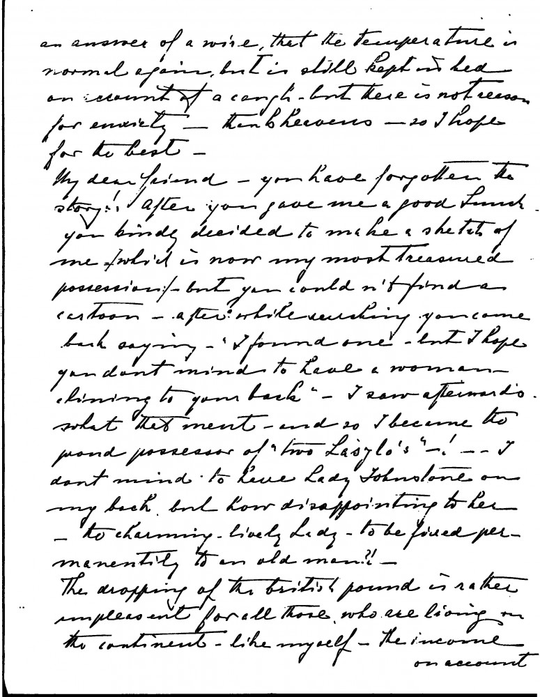 Sir Rudolf von Slatin comments on his and his daughter Anne Marie’s health. He recalls an amusing anecdote about de László’s sketch [7178], executed on the verso of Lady Johnson’s portrait [112310], making him the “proud possessor of two de Lászlós”.