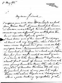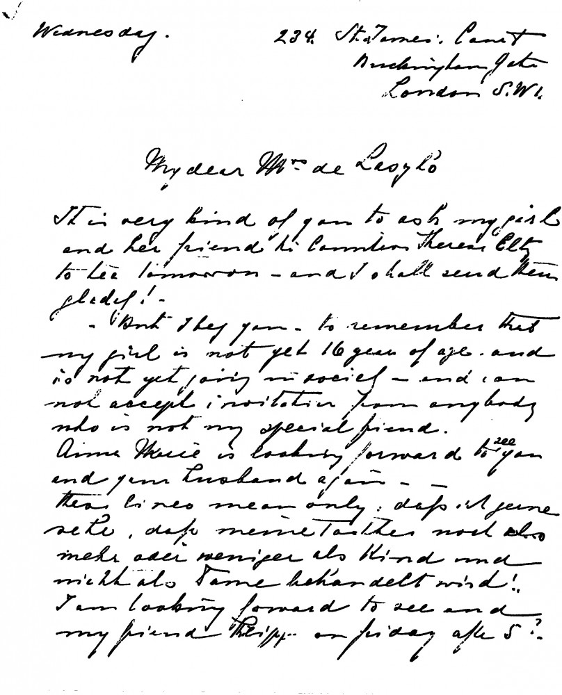 Sir Rudolf von Slatin thanks Lucy for inviting his daughter Anne Marie and her companion Countess Thérèse Eltz to tea.