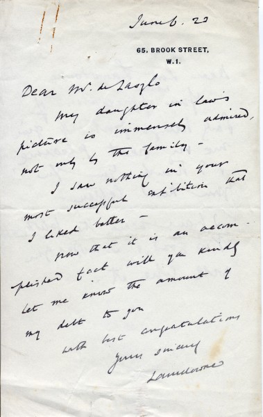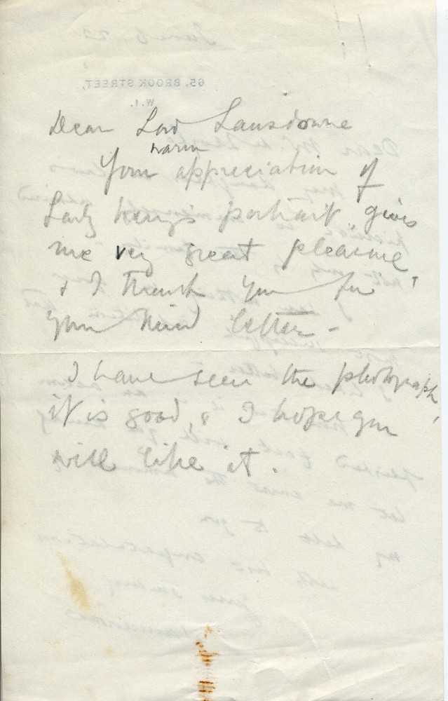 Item includes letter & draft reply. Lord Lansdowne praises the portrait of his daughter-in-law [3143], which was much admired in an exhibition (French Gallery, June 1923); asks what is owed. Draft reply from de László on verso thanking Lord Lansdowne.