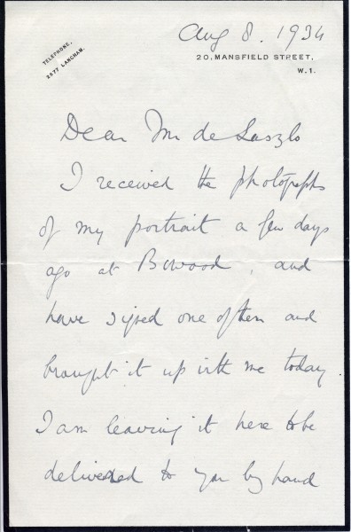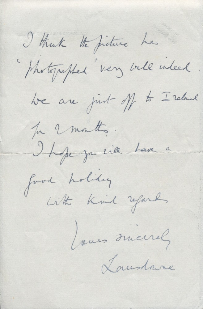 Lord Lansdowne confirms receiving photographs of his portrait [5972]; a signed one will be delivered to de László. Leaving for a two-month trip to Ireland.