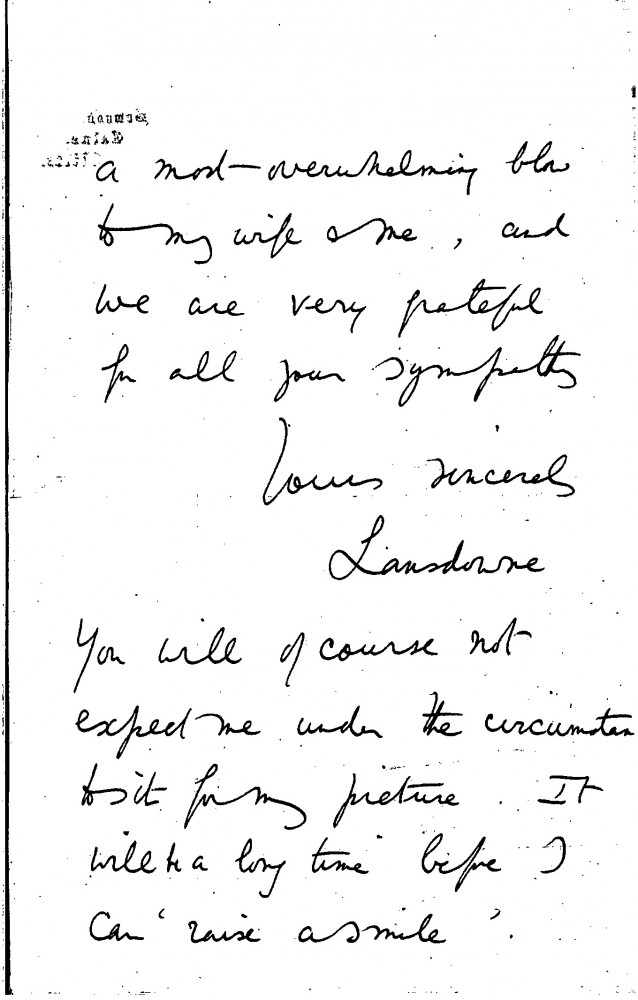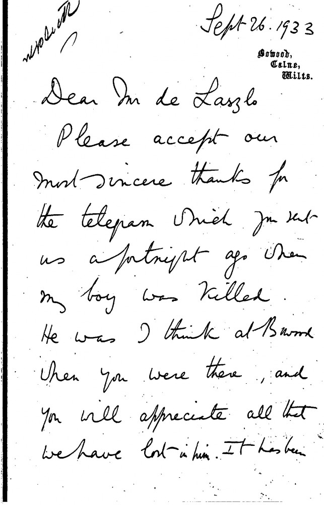 Lord Lansdowne thanks de László for his condolence telegram after the death of his son. He recalls his son may have been at Bowood during de László’s visit. Postpones sittings for his portrait [5972].