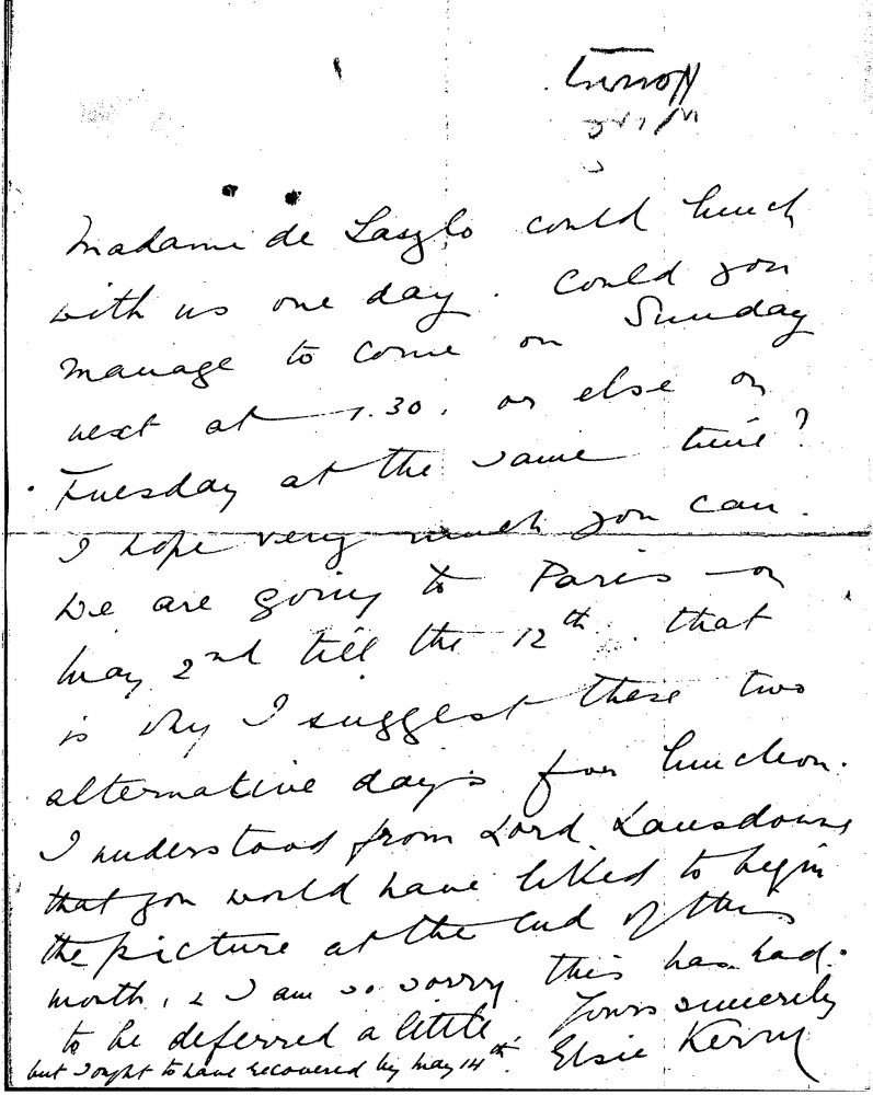 The Countess of Kerry cannot yet sit for her portrait because of a recent facial injury from a motor accident. She hopes the portrait can begin after 14 May [3143].