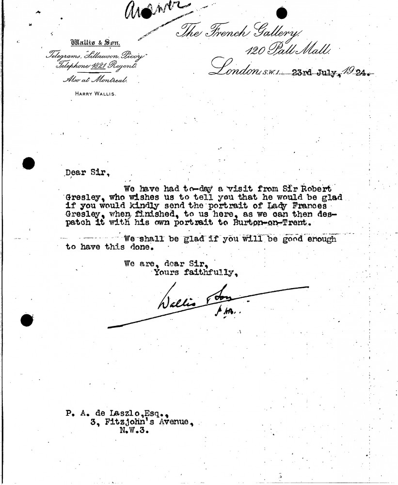 Sir Robert Gresley requests that Lady Gresley’s portrait [9916] be sent to The French Gallery / Wallis & Son upon completion, so it can be dispatched with his own portrait [12907].