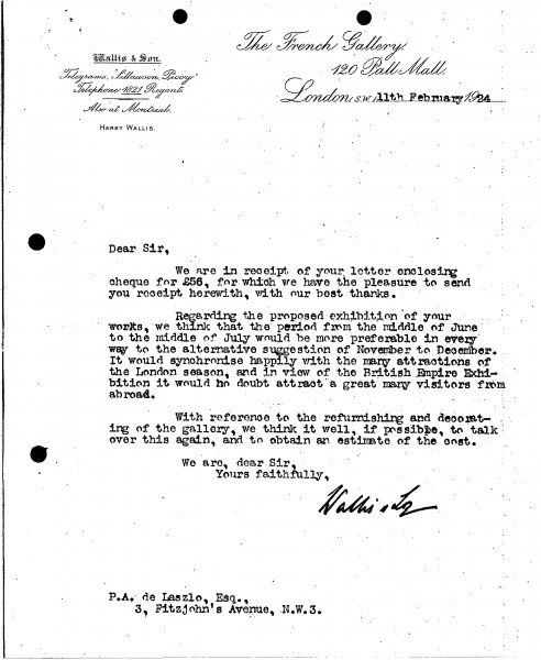 Confirms receipt of a cheque from de László and proposes dates for a planned exhibition. Recommends further discussion and a cost estimate for the gallery’s refurnishing and decoration.