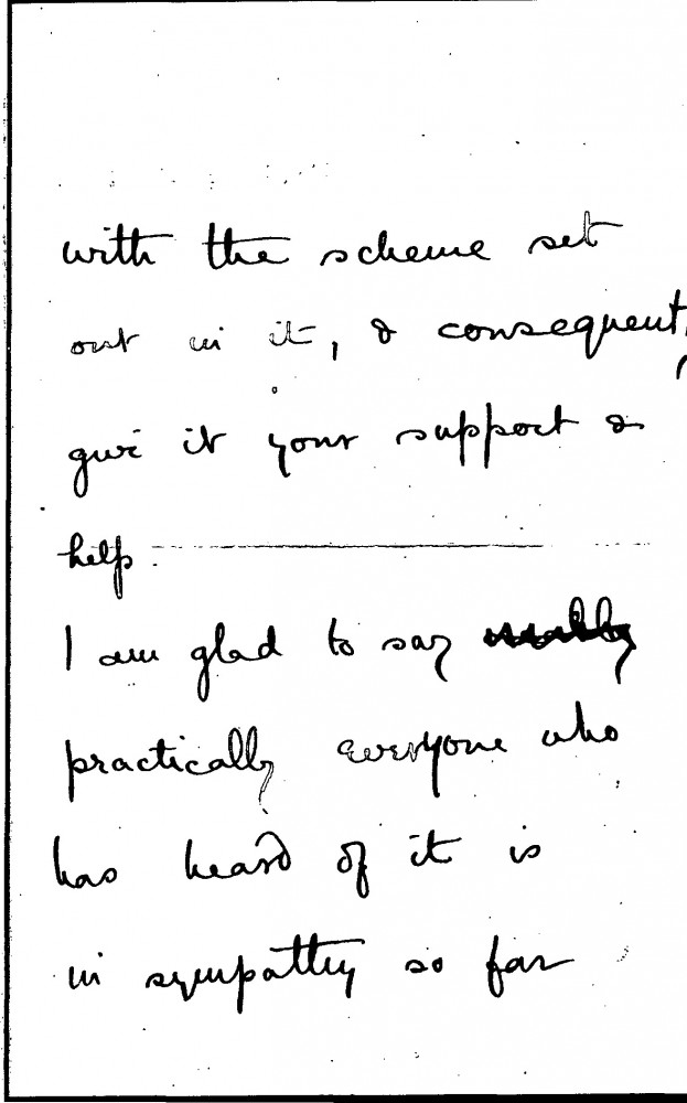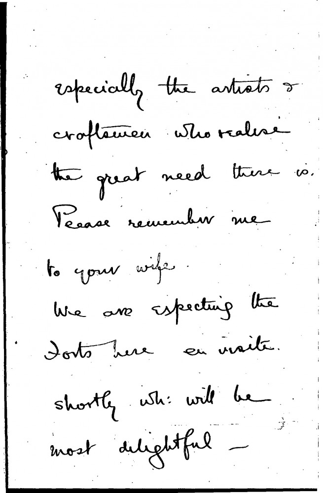 Rachel Kay-Shuttleworth writes to seek de László’s support for a proposed scheme, noting that “everyone who has heard of it is in sympathy so far especially the artists and craftsmen, who realise the great need there is.”