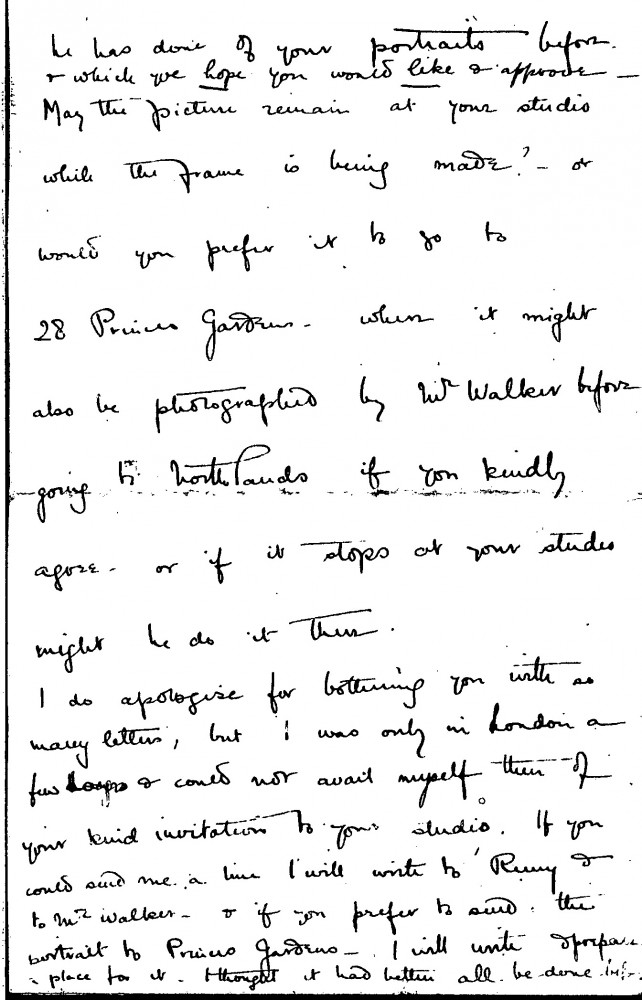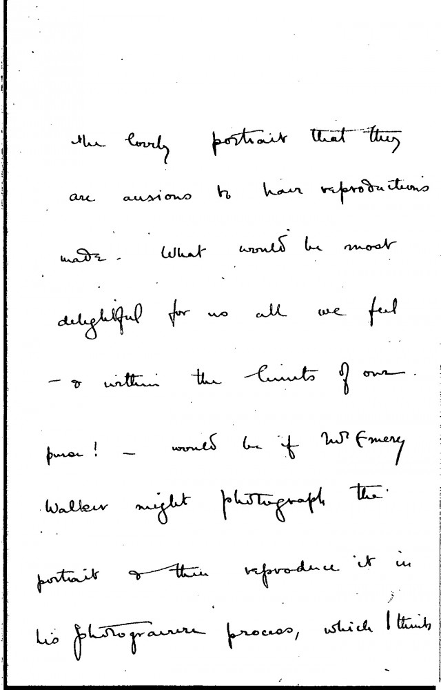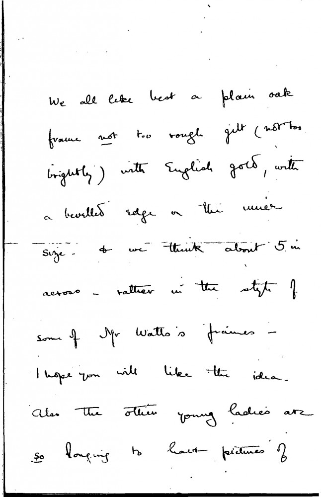 Rachel Kay-Shuttleworth, representing Sophie Weisse’s former pupils at Northlands School, requests a plain oak frame for the portrait [2097] in the style of Watts’s frames instead of the proposed Louis XIV style. They seek permission for Emery Walker to photograph and reproduce the portrait.