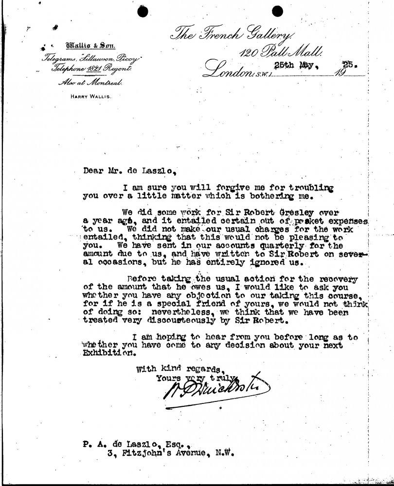 Regarding unpaid expenses from Sir Robert Gresley: despite repeated attempts to contact him, the amount remains unpaid. Winchester asks de László’s approval before taking further action. He also inquires about plans for a next exhibition.