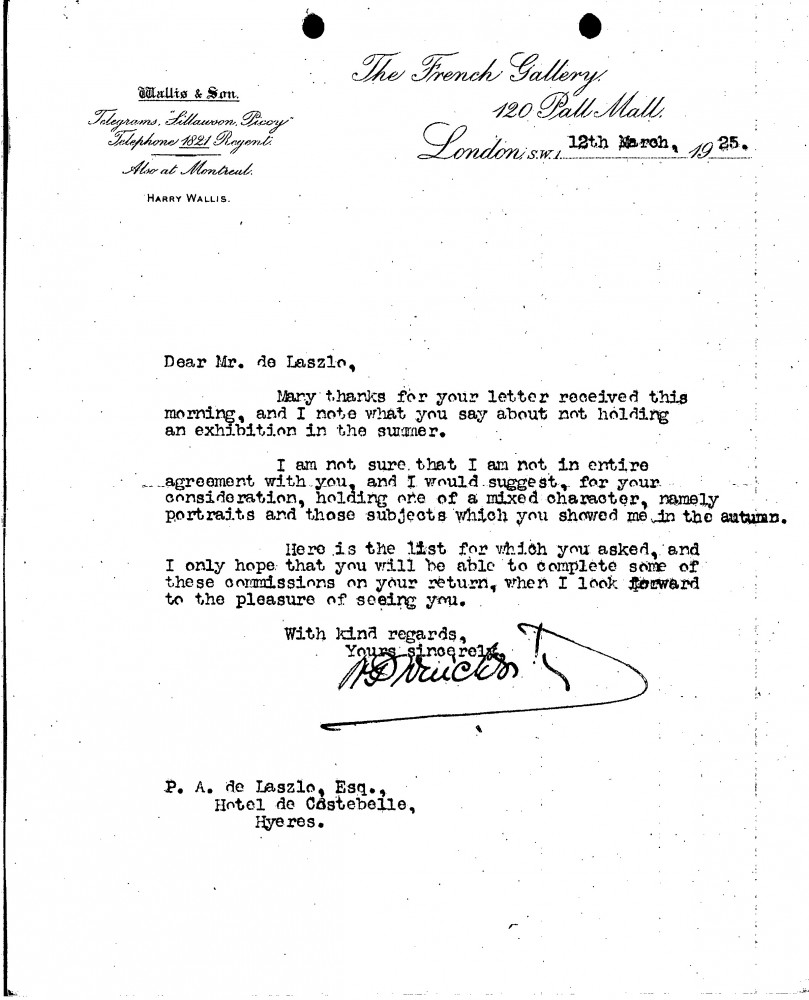 Winchester acknowledges de László's decision not to hold a summer exhibition, suggesting instead a "mixed" exhibition. He encloses a list of commissions, hoping some will be completed upon de László's return from France.