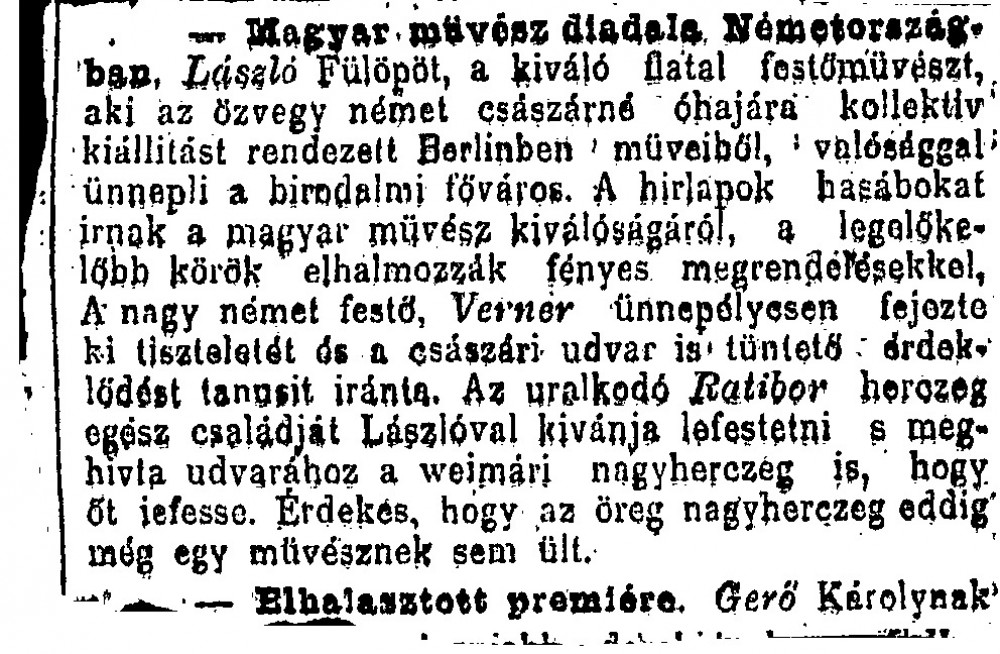 Press cutting from an unidentified publication. "Hungarian artist triumphs in Germany". Exhibition of de László's pictures in Berlin at the request of the Dowager Empress of Germany; Werner has publicly expressed his admiration for him; Prince Ratibor intends to have his family painted by de László; the Grand Duke of Weimar has invited him to court, with a view to producing a portrait [10512]