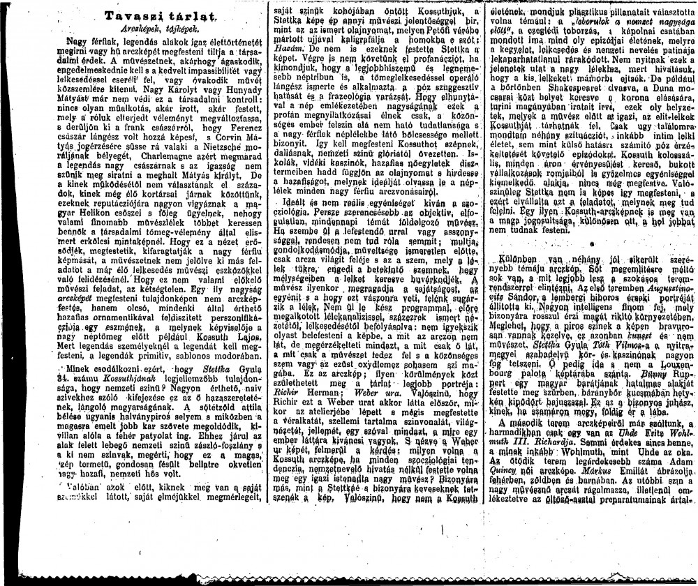 Unidentified publication. De László exhibits four portraits in room VII of the Hungarian Fine Art Society's Spring Exhibition of 1898 [4825][7243][111074][111114]; Szász compares the handling of Mme Hubay's portrait [4825] to porcelain; Katharina Friese's portrait [7243] "lacks a lifelike sense of unforced nonchalance"; whilst the other two works [111074][111114] are more successful, "neither can be said to demonstrate any kind of progress or development on the part of the artist".