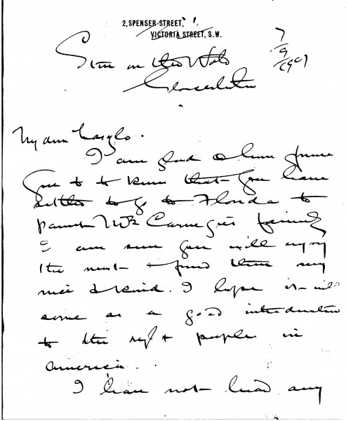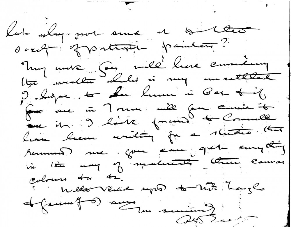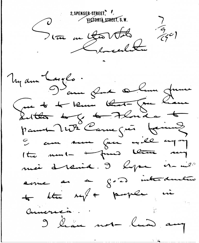 The painter, Alfred East, writes that he is glad de László has decided to paint the Carnegie family in Florida, which "will serve as a good introduction to the right people in America" (see DLA010-0005 regarding this commission). Letter also concerns a work of de László's that East says cannot be exhibited at the Royal Society of British Artists since de László was not then a member (he was elected an Honorary Member the following year); East suggests he sends the work to the Royal Society of Portrait Painters. Mentions he is looking forward to Cornwall and has been enquiring after a studio (later that year, East and de László travelled together to St. Ives) (DLA004-0004 and DLA004-0005 were previously partial items that have now been merged into DLA004-0004. DLA004-0005 has been deleted, AD 04/03/21)