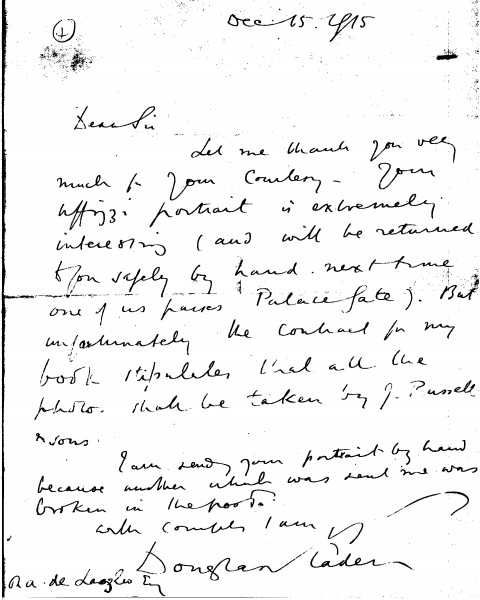 The sender thanks de László and says his "Uffizzi portrait" [9724] is "extremely interesting", but regrets that the contract for his book stipulates photographs are to be taken by J. Russell & Sons