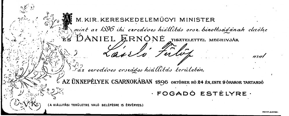 Invitation to attend a reception on 24th October 1896 at the Millennial Exhibition, issued by the Minister of Commerce, Ernő Dániel, and his wife