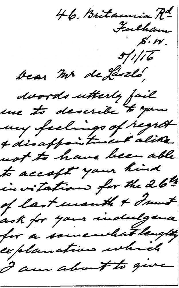 The sender apologises at length for not having replied to de László's invitation of the previous month, which, due to a change of address and various other circumstances, he did not receive until it was too late; he would now like to rearrange a meeting (DLA004-0016 and DLA004-0017 were previously partial items that have now been merged into DLA004-0016. DLA004-0017 has been deleted, AD 04/03/21)