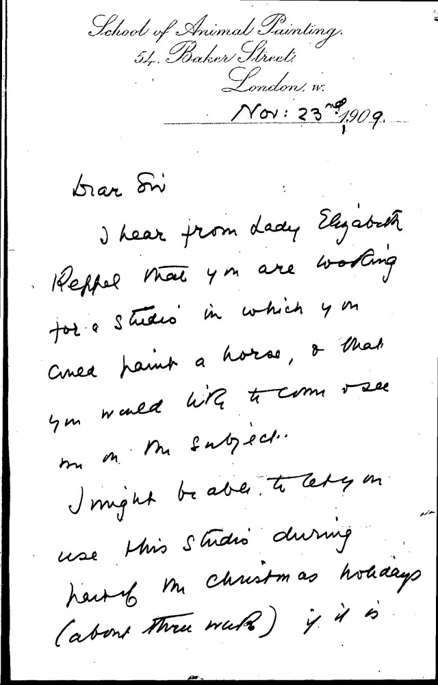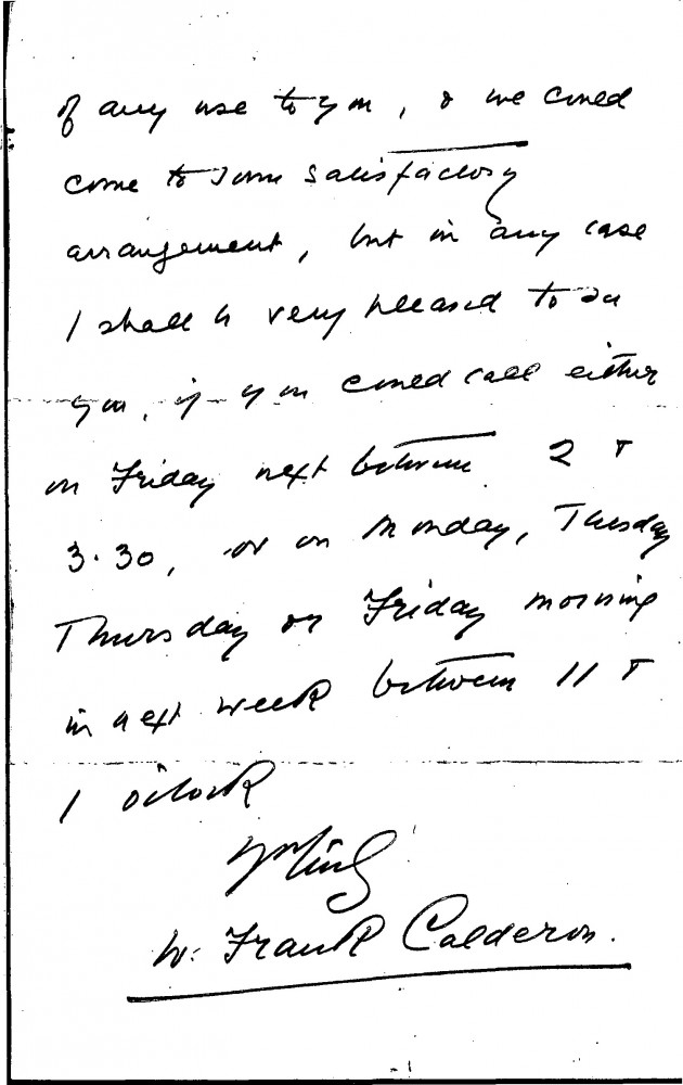 Letter in which the artist, William Frank Calderon, offers use of his studio to de László, who was looking for a studio in which he could paint a horse, probably the portrait of the German Emperor [4952]