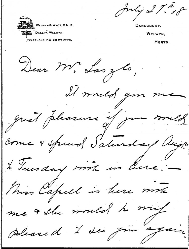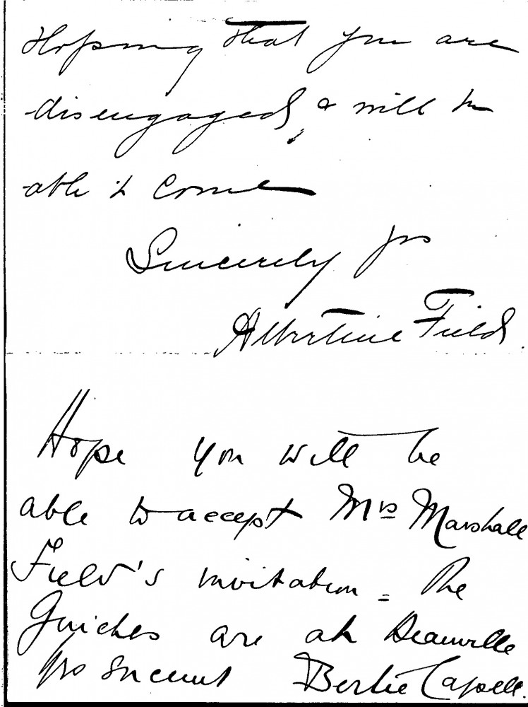 Multiple items. Letter dated 27th July 1908 is an invitation to de László from Mrs Marshall Field; this letter includes an appended note from Bertie Capell. The item also includes a draft letter in German from de László politely declining the invitation