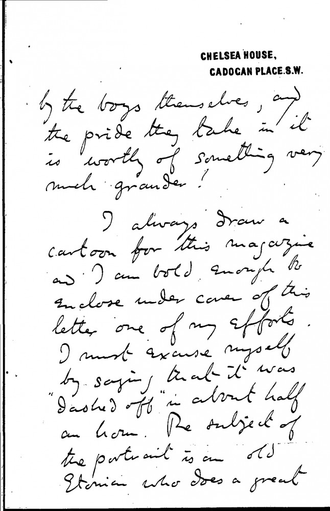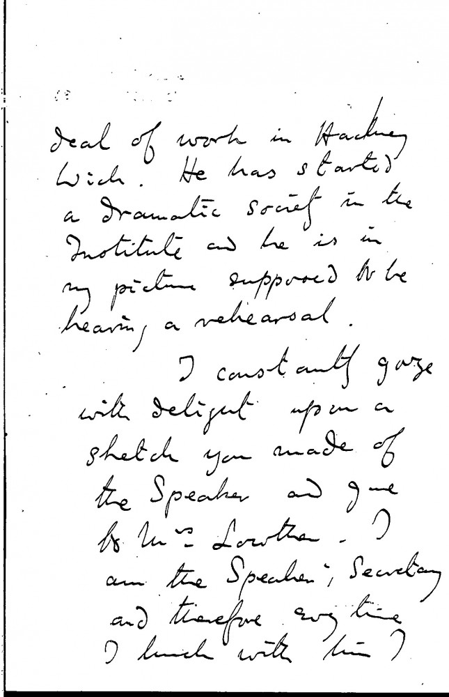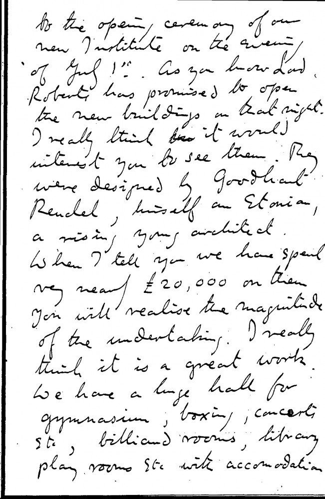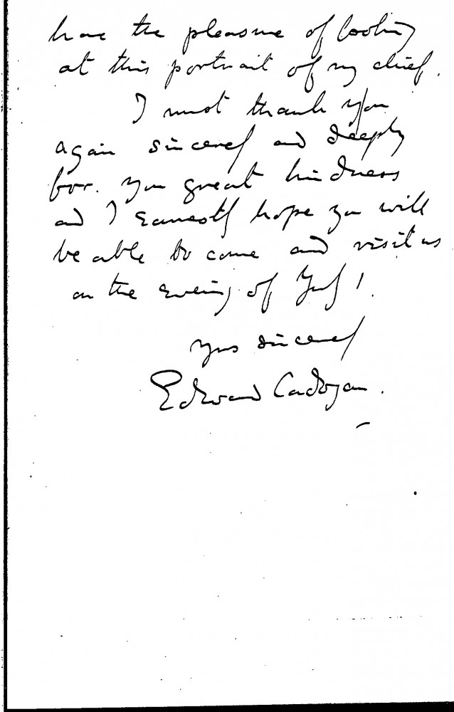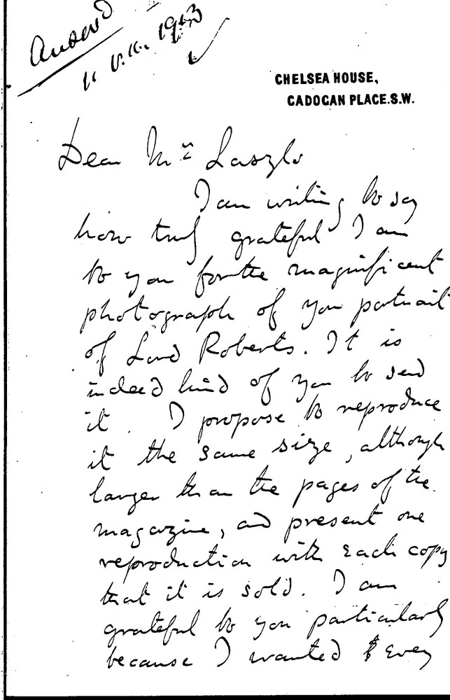 Letter thanking de László's for the photograph of Lord Roberts' portrait [6924], which will be reproduced in a magazine; also invites de László to the opening of a new Institute, which, based on the letter's date and reference to the architect, Harry Stuart Goodhart-Rendel, was likely the Eton Manor Boys' Club. From 1911-21, Cadogan was secretary to Speaker of the House of Commons, James Lowther, and, in this letter, praises de László's portrait of the Speaker