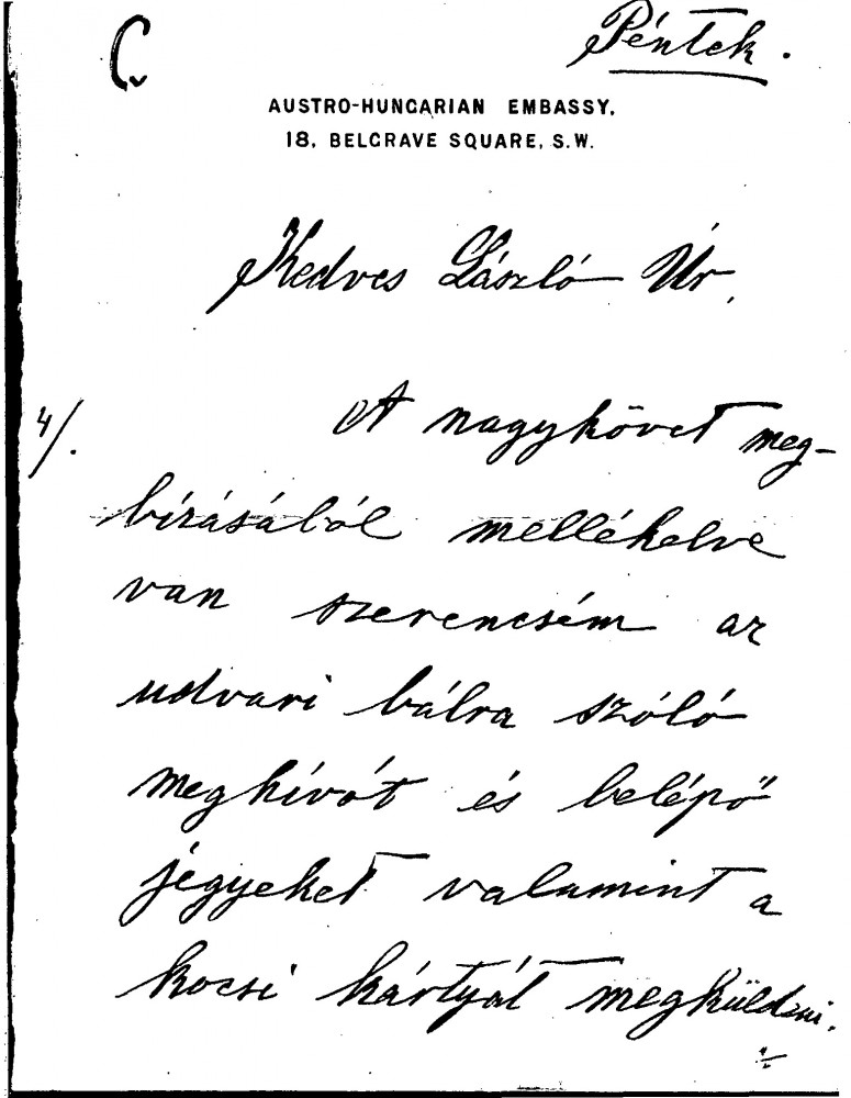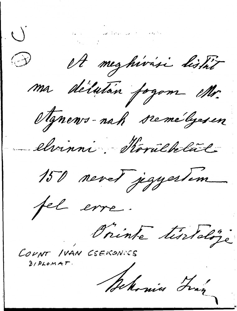 Count Iván Csekonics, writing on behalf of the Austro-Hungarian Ambassador, enclosing an invitation to the Court Ball together with a carriage ticket. Says he will personally take the list of those invited to Mr. Agnew; there are approximately 150 names on the list
