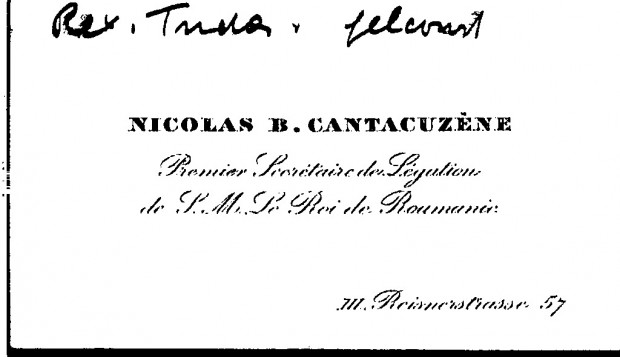 Visit card of Nicolas B. Cantacuzène, First Secretary of the Legation of H.M. The King of Roumania