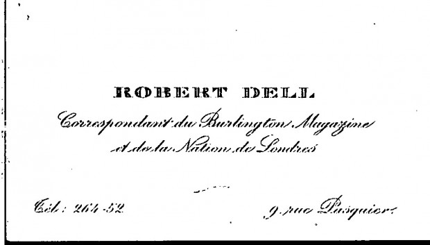 Visit card of Robert Dell, the first editor of the Burlington Magazine; art correspondent for the Manchester Guardian, Nation, American Art News and French correspondent for the Burlington Magazine from April 1907