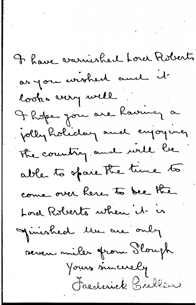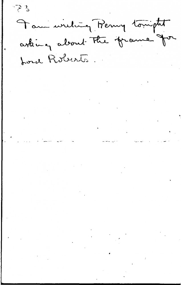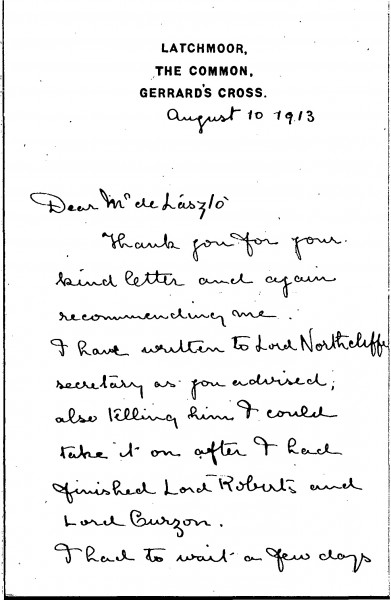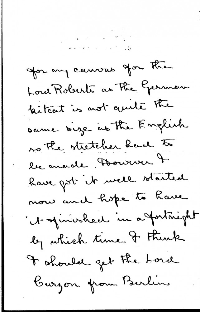 Letter from one of de László's few authorised copyists, Frederick Cullen, thanking de László for recommending him to Lord Northcliffe. Will begin his copy of Lord Northcliffe's portrait [4764] once he has finished the copies [6929] [3887] after Lord Roberts and Lord Curzon's portraits [6931] [3890]. Mentions framing and varnishing the Lord Roberts copy [6929]