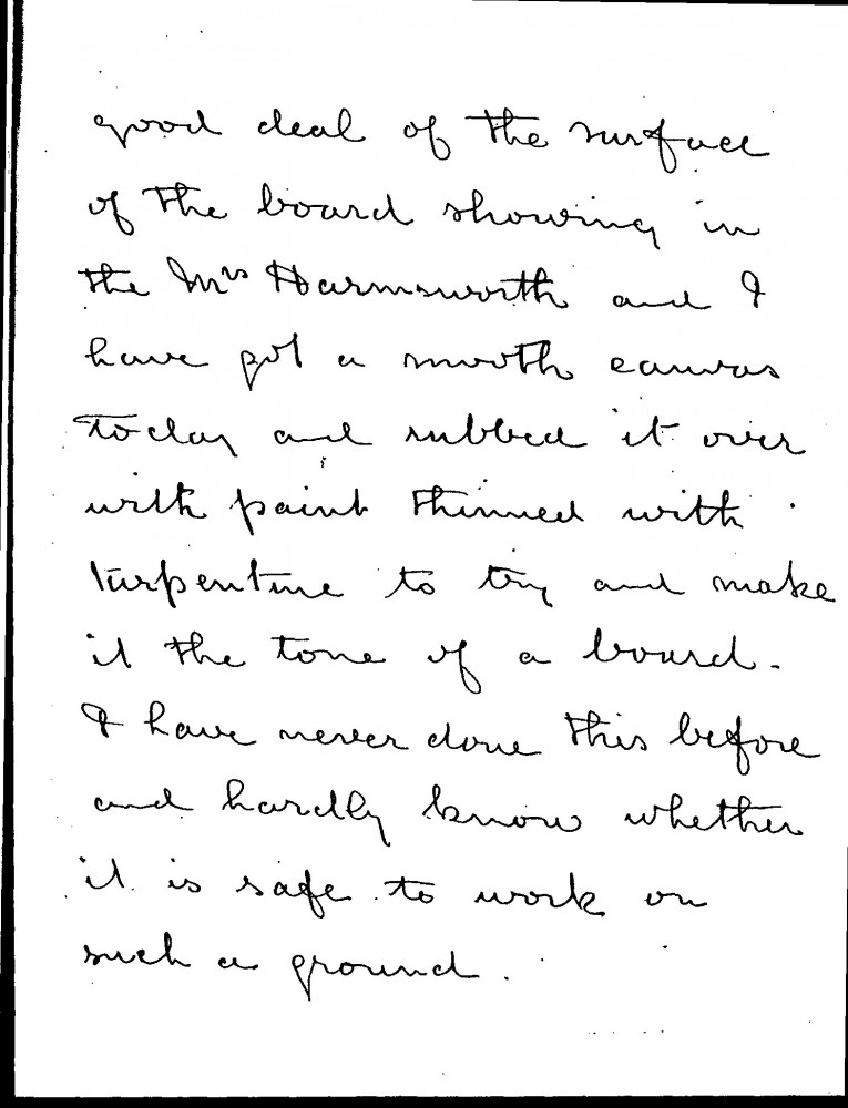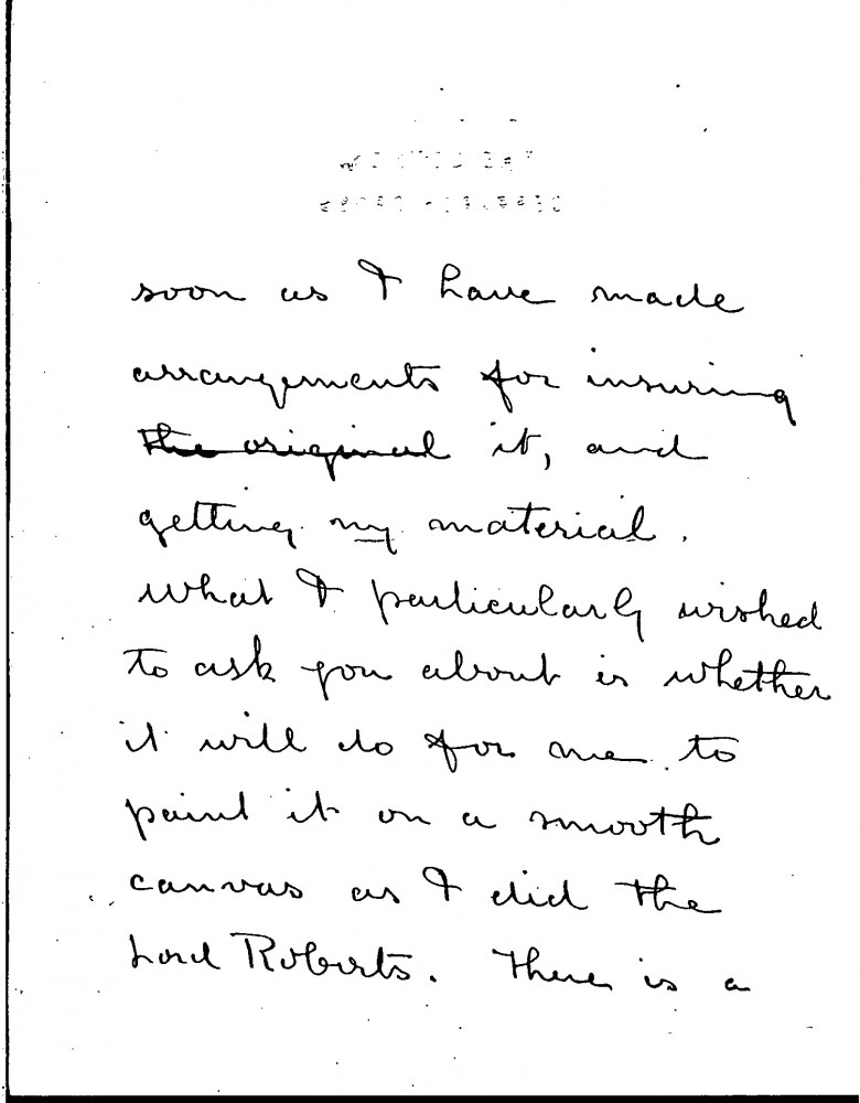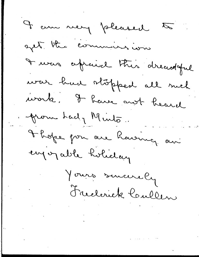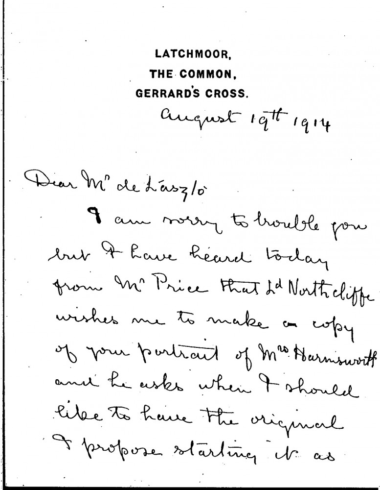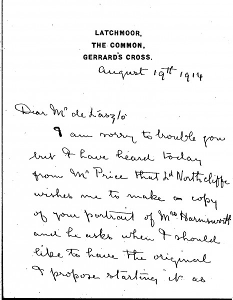 Letter from one of de László's few authorised copyists, Frederick Cullen, confirming a commission from Lord Northcliffe to copy [4751 or 4753] de László's portrait of Mrs Harmsworth [6909]; he is very pleased as he was "afraid this dreadful war had stopped all such work." Cullen asks de László whether it should be painted on a smooth canvas, and proposes a new working method given the original has "a good deal of the surface board showing"
