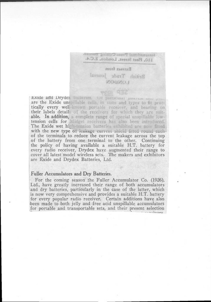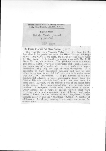 British Trade Journal. Article on a new radio component developed by Stephen de Laszlo and J.H. Owen Harries that replaces multiple parts, making radios simpler, cheaper, and more reliable.