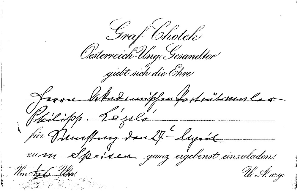 Previous See list Next 060-0006 de Laszlo Archive © de Laszlo Foundation 060-0006 Invitation from Count Chotek to László for dinner. Accession number 060-0006 Type Invitation Sender Chotek von Chotkowa und Wognin, Count Bohuslav (1829 - 1896) Recipient László, Philip Alexius de (1869 - 1937) Close 060-0006 Invitation from Count Chotek to László, Letters C 1897 Portrait, 060-0006