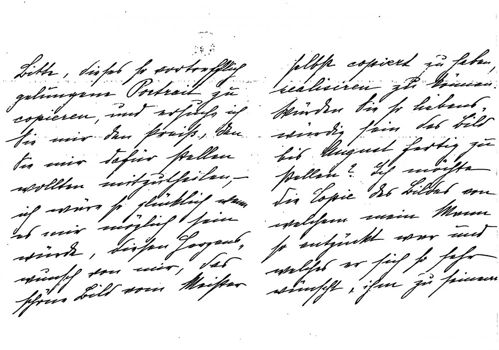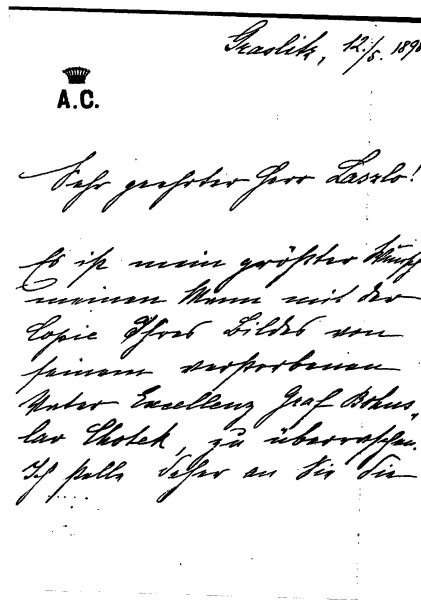 Countess Chotek wishes to surprise her husband with a copy of de László's portrait of his late father [11319] for his birthday. Asks whether de László would paint the copy himself and how much it might be.