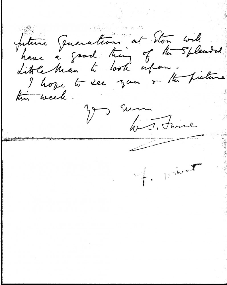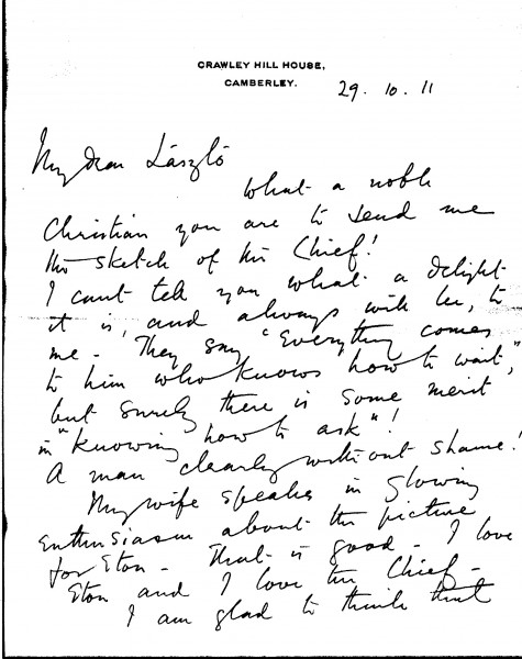 Lieutenant General Sir William Thomas Furse thanks de László for the sketch of "the chief" (Lord Roberts) and writes that his wife "speaks in glowing enthusiasm" about the portrait of Lord Roberts in Eton [6924]. The sender, Eton educated, had been Aide-de-Camp to Lord Roberts from 1891 to 1893. "I love Eton and I love the Chief", he states in this letter