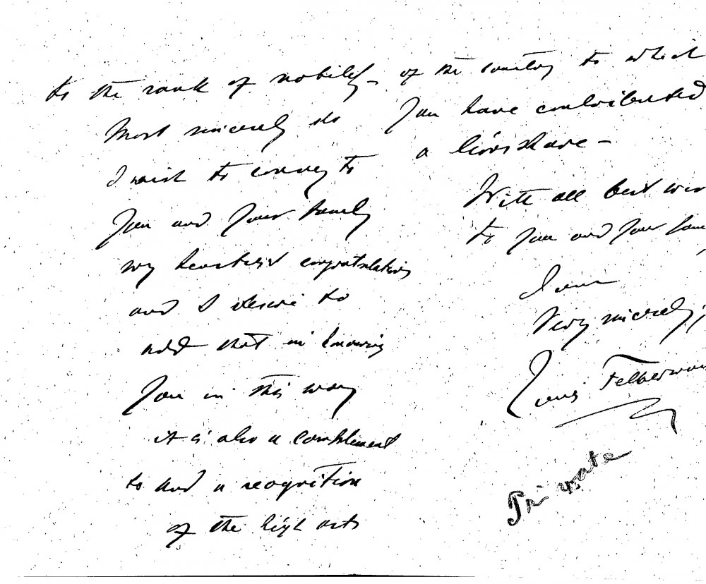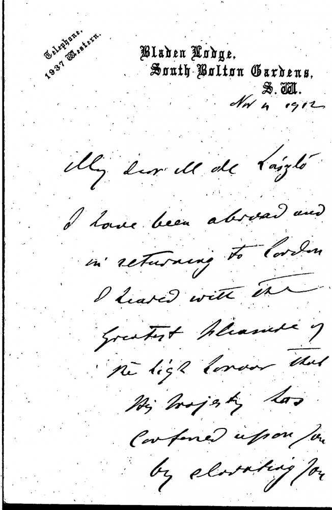 The sender, a Hungarian author who had settled in London, here congratulates de László on his ennoblement (earlier in 1912 de László had been ennobled by Emperor Franz Joseph I with a Patent of Hereditary Nobility). "In honouring you in this way", writes Felberman, "it is also a complement to and a recognition of the high arts of the country to which you have contributed a lion’s share"