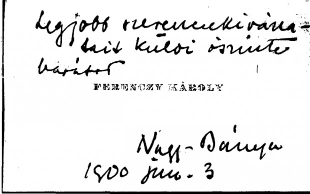 Visit card of Károly Ferenczy, an important impressionist painter and one of the founders of the Nagybánya School in Transylvania, who sends best wishes to de László "from your sincere friend"