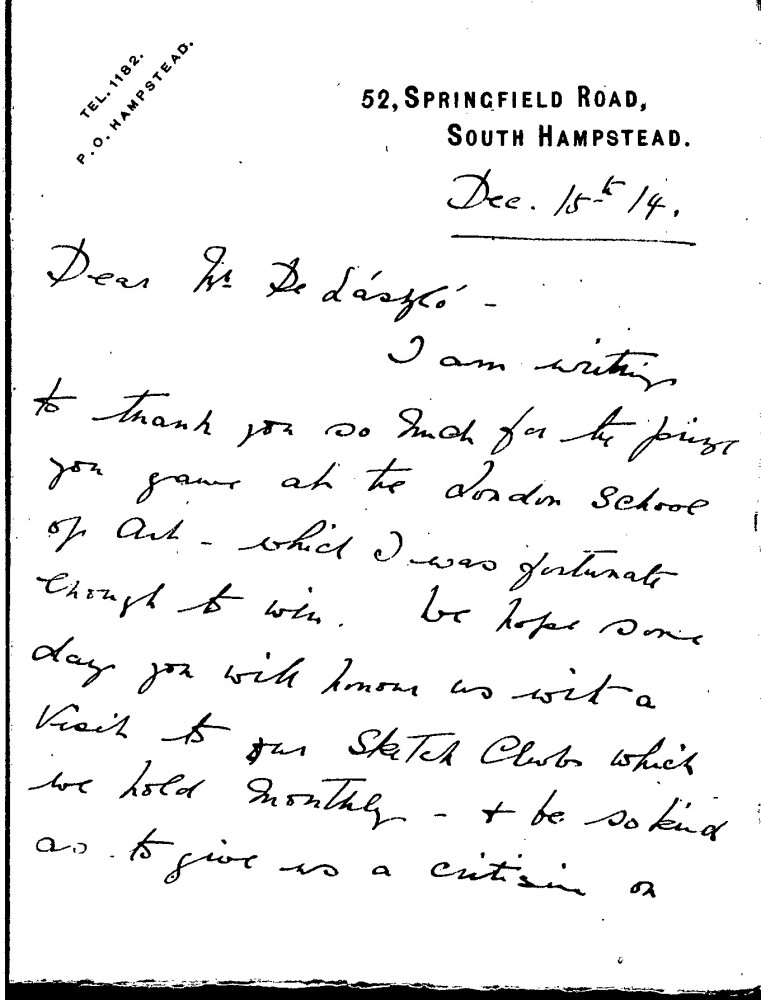 Letter thanking de László for the prize he awarded at the London School of Art, which the letter's sender had won