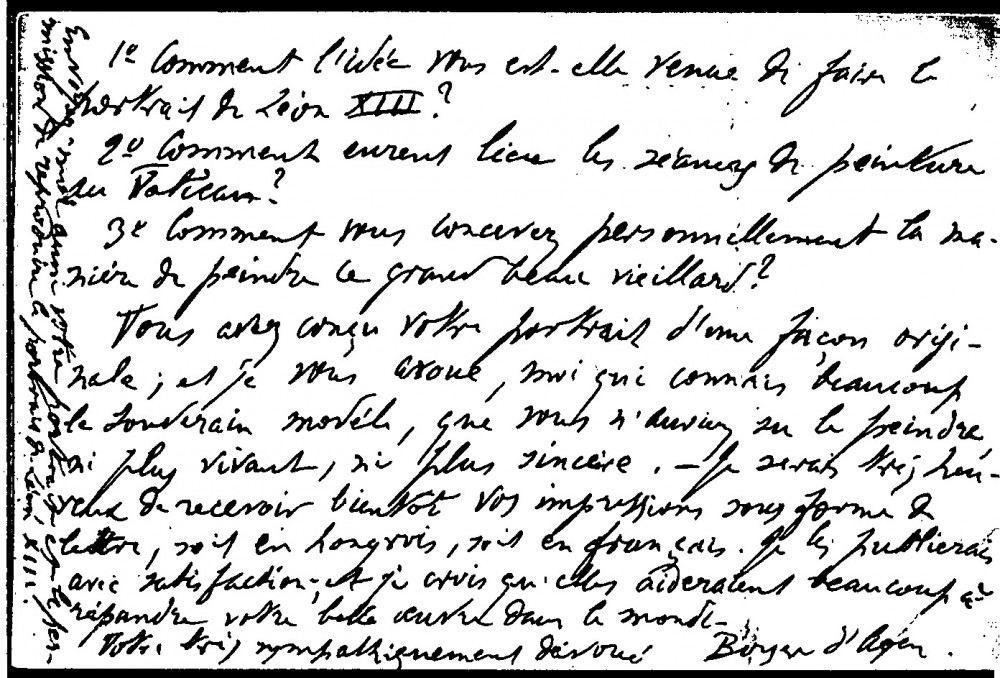 Boyer d'Agen asks de László about conception & sittings of Pope Leo XIII's [4509] portrait on view at Exposition Universelle. In 1891 he had also asked the artist Théobald Chartran for his impressions of the Pope. Praises de László's portrait as "remarkable", "original", "lively", "sincere"