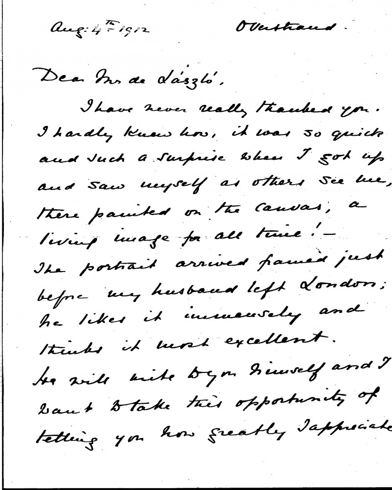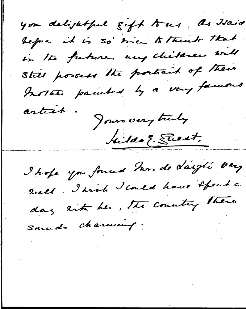 Letter in which the sender profusely thanks de László for the gift of her portrait [5401], and adds that her husband, the Egyptologist Arthur Rhuvon Guest, "likes it immensely and thinks it most excellent". She finishes the letter by asking after Lucy
