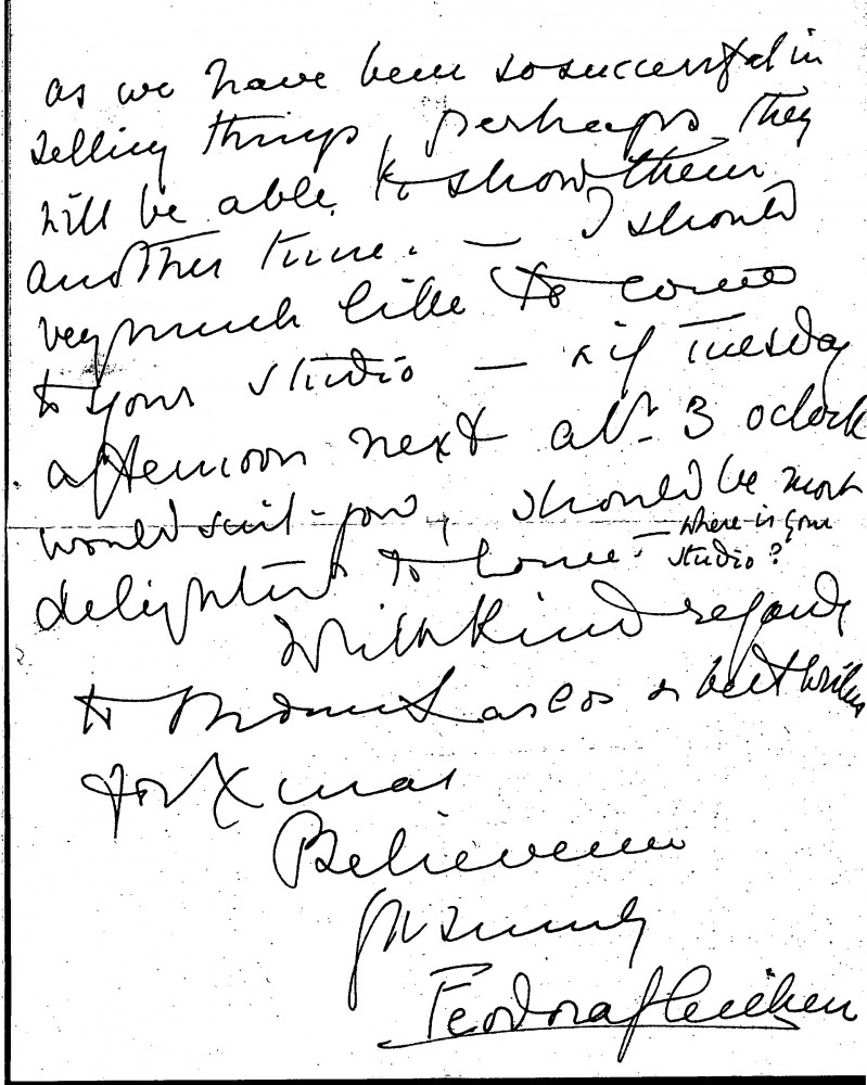 The sculptress Lady Feodora Georgina Maud Gleichen thanks de László for his "kind appreciation" of the group exhibition she helped put together at Warings; she would like to come to de László's studio and asks where it is