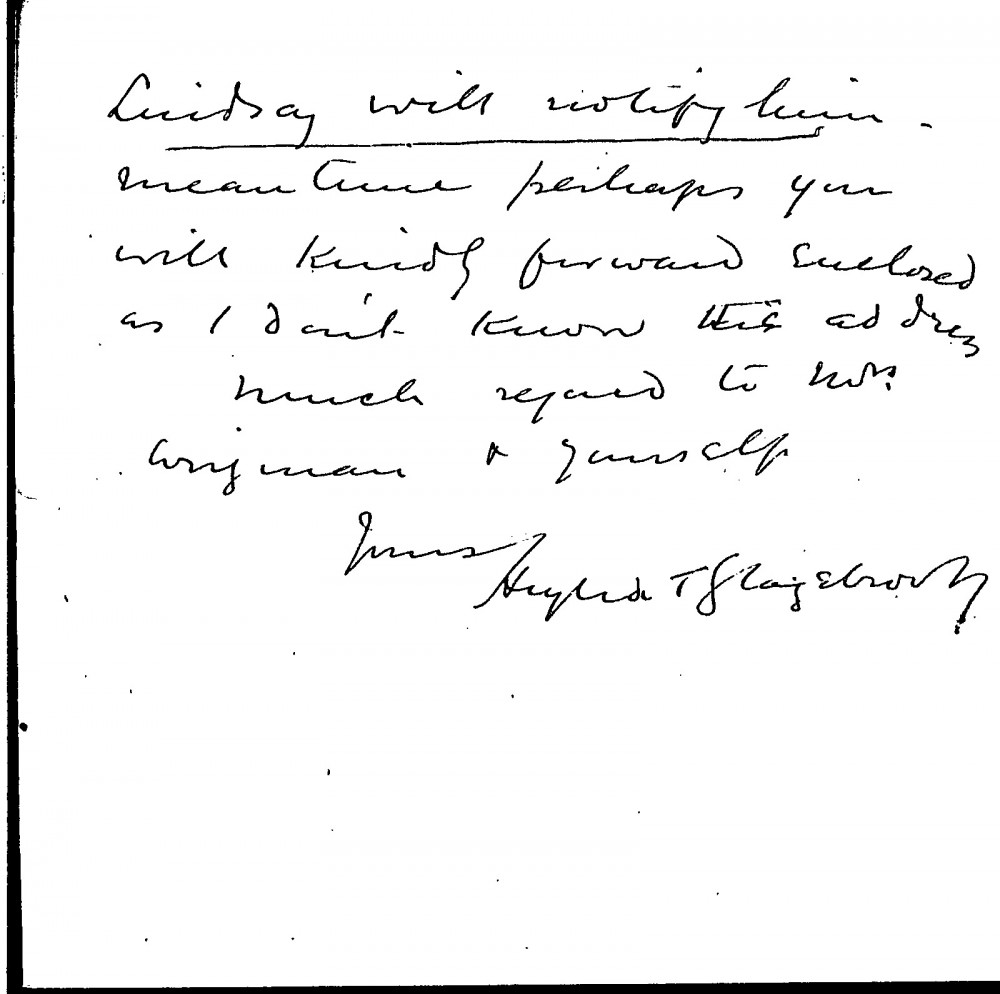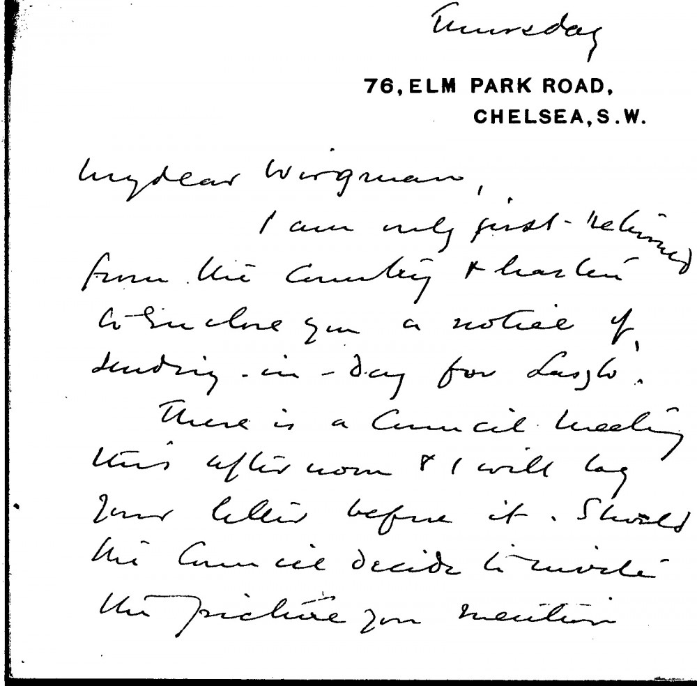 Correspondence between the two painters, Hugh de Twenebrooks Glazebrook and Theodore Blake Wirgman, concerning a sending-in-day notice for a painting by de László, which Wirgman has mentioned to Glazebrook