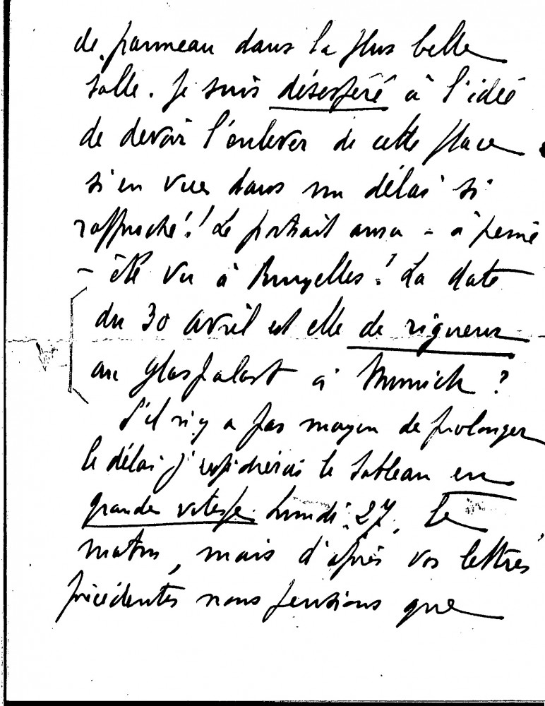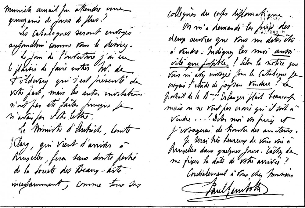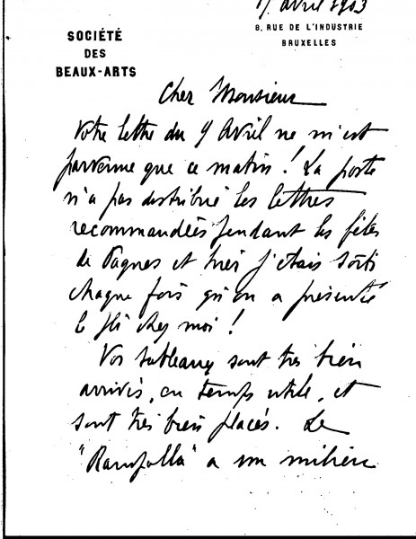 Letter from Paul Lambotte, then Secretary of the Société des Beaux-Arts in Brussels, concerning the Société's 1903 exhibition. Lambotte lets de László know that his paintings are hung in good positions, particularly his portrait of Cardinal Rampolla [4511]. He regrets that [4511] must be sent to the Munich Glaspalast before the exhibition finishes, and asks whether its departure can be postponed. He has been asked prices for two of de László's works, adding that he thought the study of the peasant [110949] was sold, and that people cannot believe his portrait of Baroness d’Erlanger is for sale. "Tell me your prices and I will try to find buyers", he writes