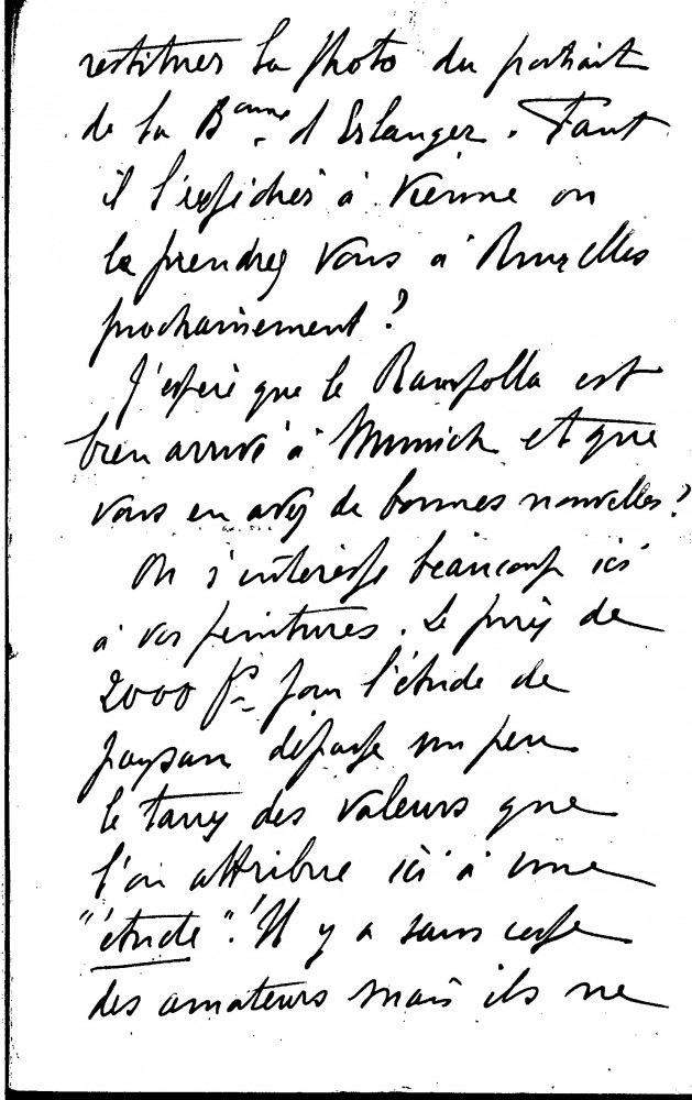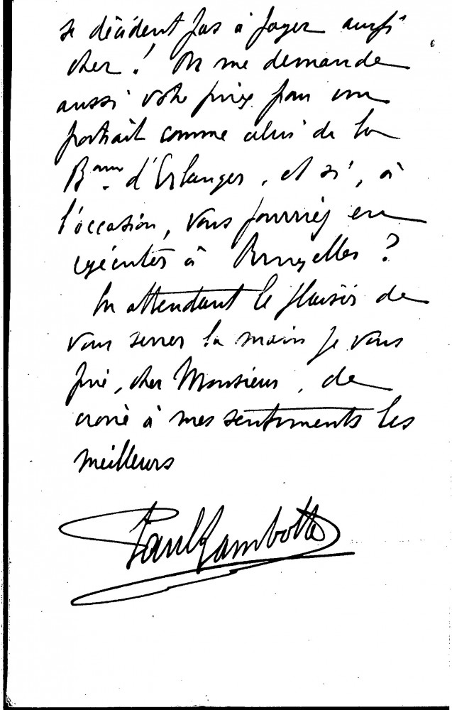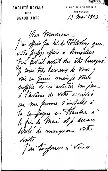 Letter from Paul Lambotte, then Secretary of the Société des Beaux-Arts in Brussels, concerning de László's postponed visit to Brussels and the Société's 1903 exhibition. He notes that the asking price for [110949] is on the high side for a study, and that there have been enquiries as to what his fee would be for a portrait like that of the Baronne d'Erlanger