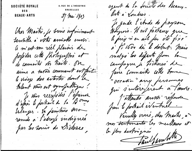 Letter from Paul Lambotte, then Secretary of the Société des Beaux-Arts in Brussels, in which he thanks de László for sending the photograph of himself, he returns a proof of the portrait of the Baronne d'Erlanger and mentions the transportation of that portrait, he regrets the price that was initially set for [110949], and says he is awaiting an answer regarding a possible commission