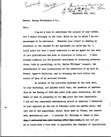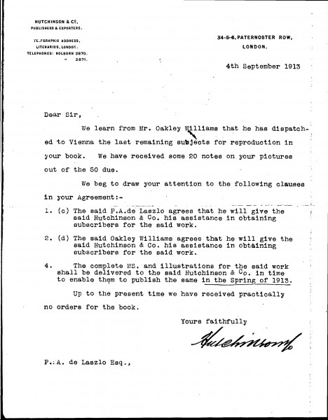 Letter from the publishing house, Hutchinson & Co., regarding de László and Oakley Williams' obligations pursuant to their "Agreement" to deliver a manuscript, illustrations and subscribers by the Spring of 1913; the letter is dated September 1913. For de László's incensed reply, see DLA007-0010: "I... resent the tone of your communication"