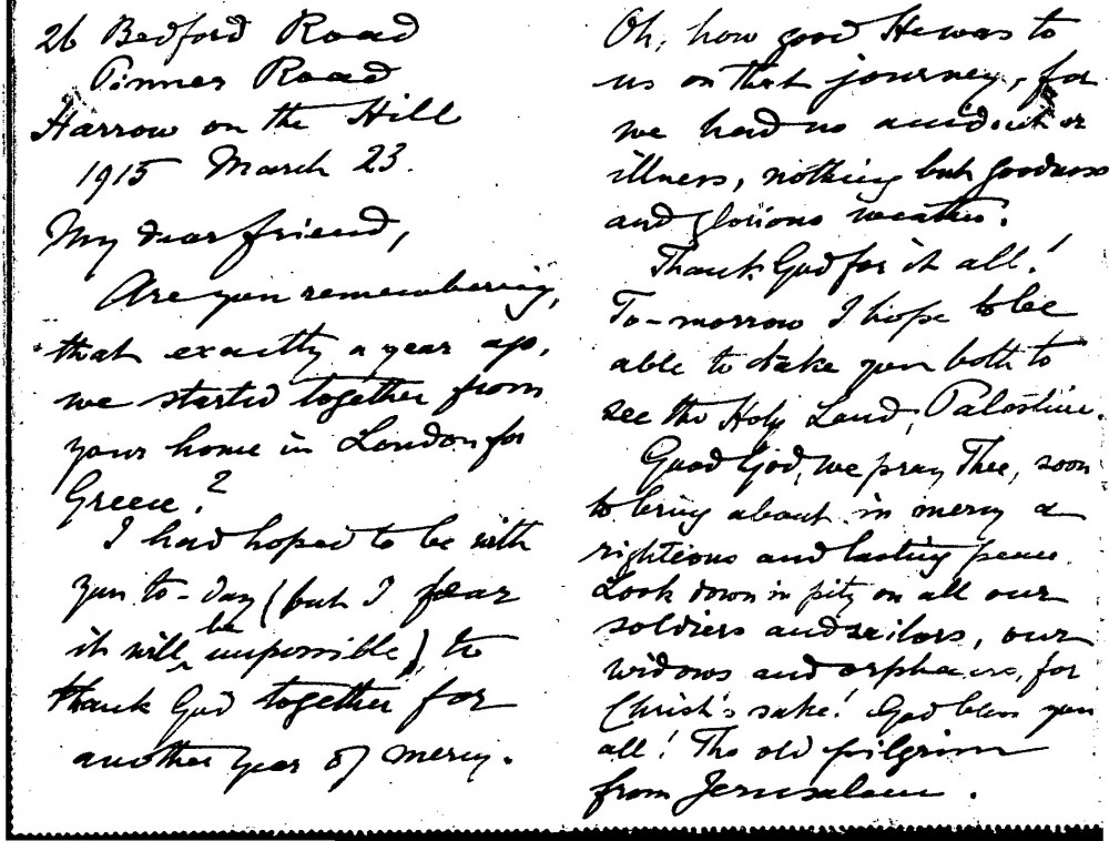 Letter from the Reverend William Henry Hechler to de László reminiscing about the trip the two had taken together to Greece the year before (de László had received a commission to paint the Greek royal family in Athens and invited the Reverend as his companion and secretary)