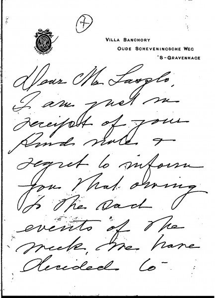 Letter from an unknown sender (illegible signature) to de László regarding the postponement of a meeting