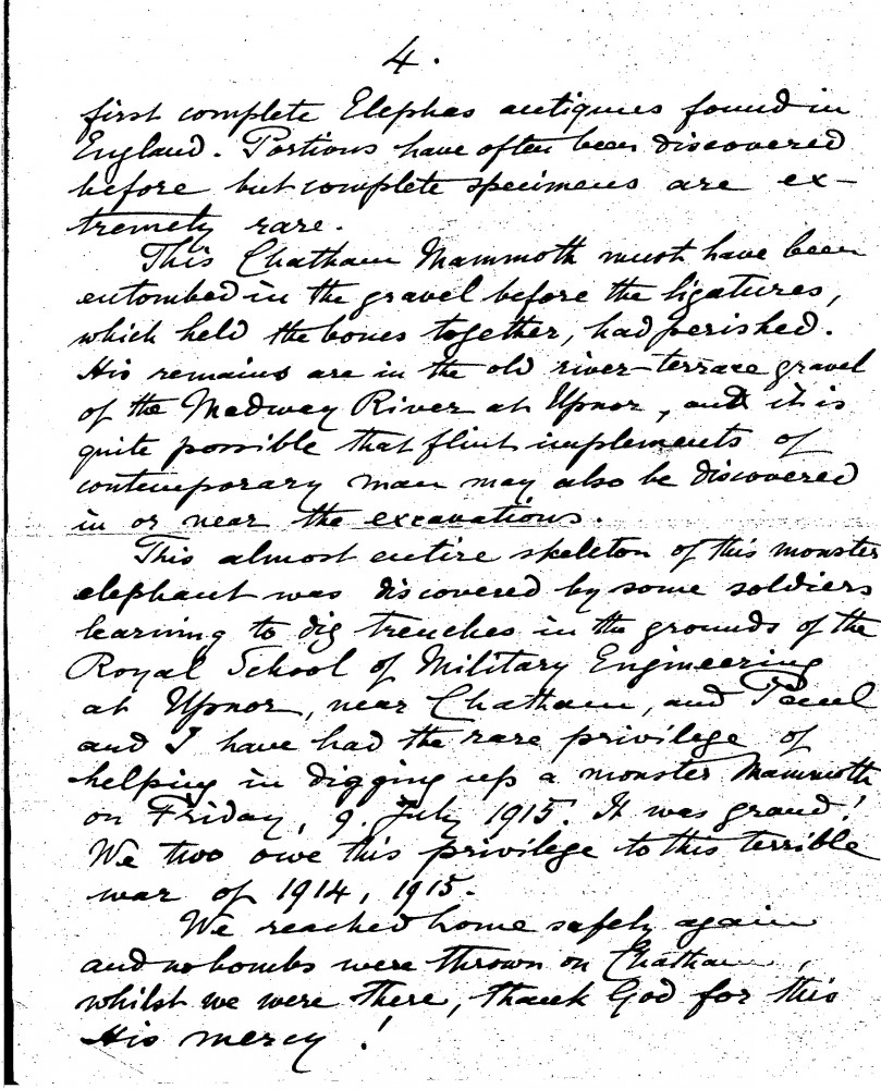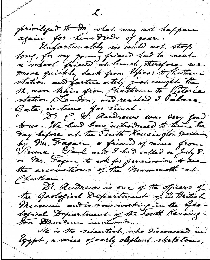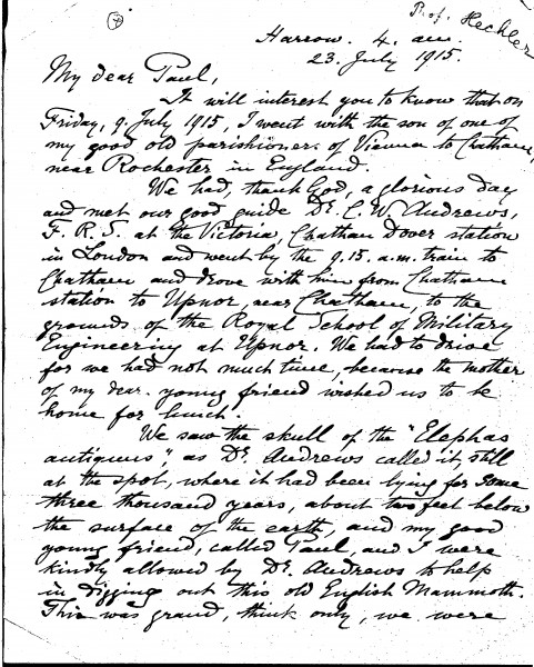 Letter from The Reverend William Henry Hechler to Paul de Laszlo in which the sender recounts a day spent in the company of the British paleontologist Charles William Andrews during the course of his excavations of "Elephas Antiquus" (an extinct species of straight-tusked Elephant) in Upnor, Kent